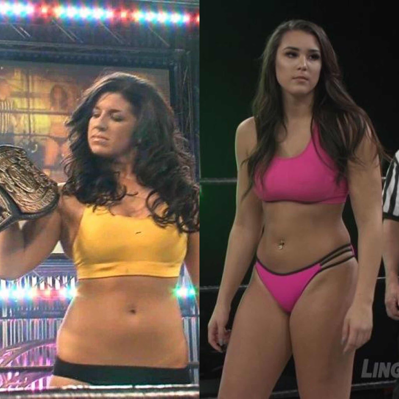 Kylie makes her way to the ring wearing a pink with black stripes bra and matching panties.
