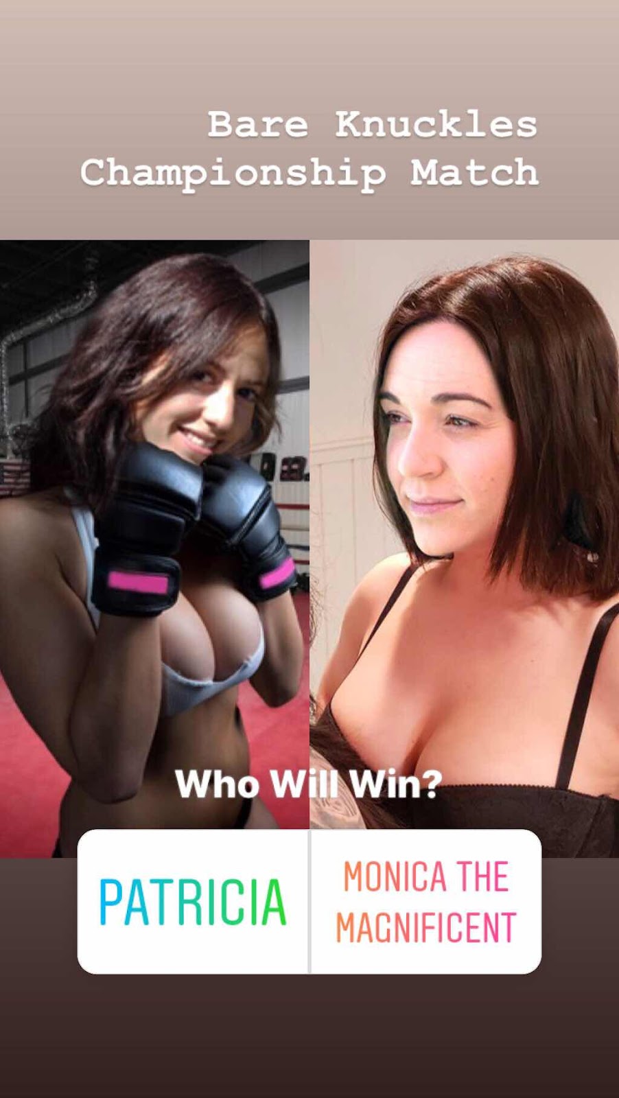 A Bare Knuckles Championship match between hated rivals Patricia, who is the reigning champion and the challenger, Monica The Magnificent, who is making her 2nd attempt to take this title from Patricia.